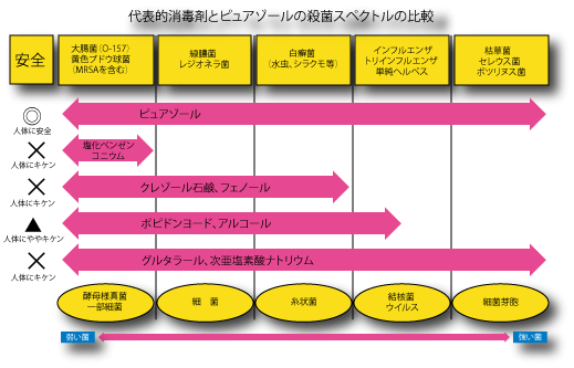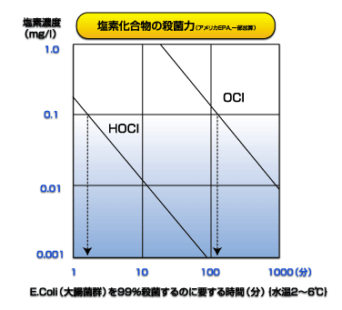 次亜塩素酸イオンの約80倍もあります。アメリカ環境保護局[EPA]の検査で、大腸菌を死滅させるのに要した時間を、次亜塩素酸が1分とすれば、次亜塩素酸イオンでは80分かかっています。
